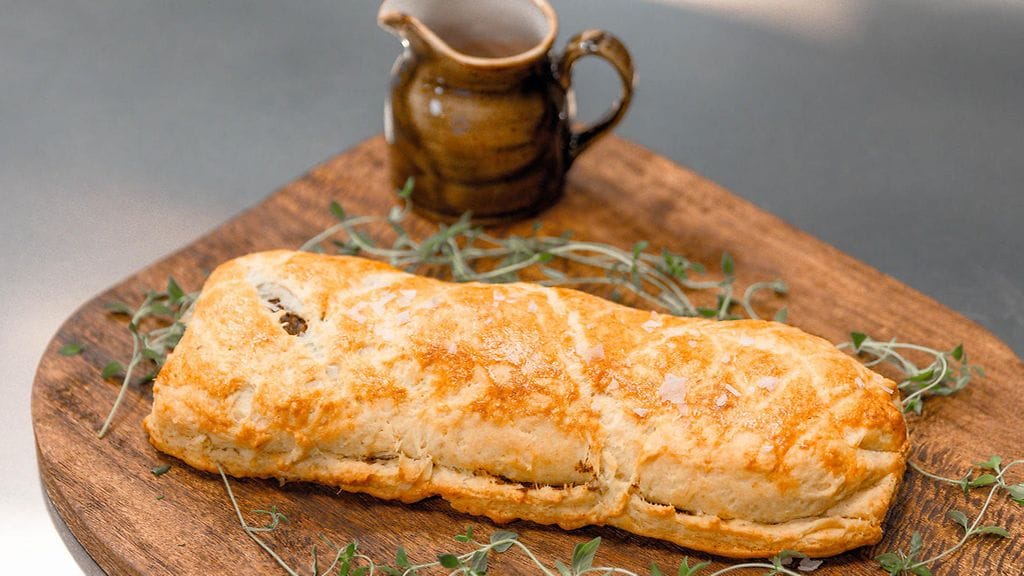 BEET WELLINGTON: Kaulitse voitaikina ohueksi levyksi leivinpaperin päällä. Aseta ensin pohjalle puolet sienimassasta, kuorittua ja viipaloitua raita- tai punajuurta, portobellot ja vielä päälle toinen puolikas sienimassasta. Kiedo voitaikina tiukaksi paketiksi leivinpaperia apuna käyttäen ja viillä veitsellä kauniit kuviot pintaan. Älä viillä taikinaa läpi asti. Paista Wellingtonia 200 asteisessa uunissa noin 45 min kunnes taikina on kypsää ja kauniin väristä. Nosta tarjoilualustalle, koristele timjamin oksilla ja tarjoile kastikkeen kanssa.