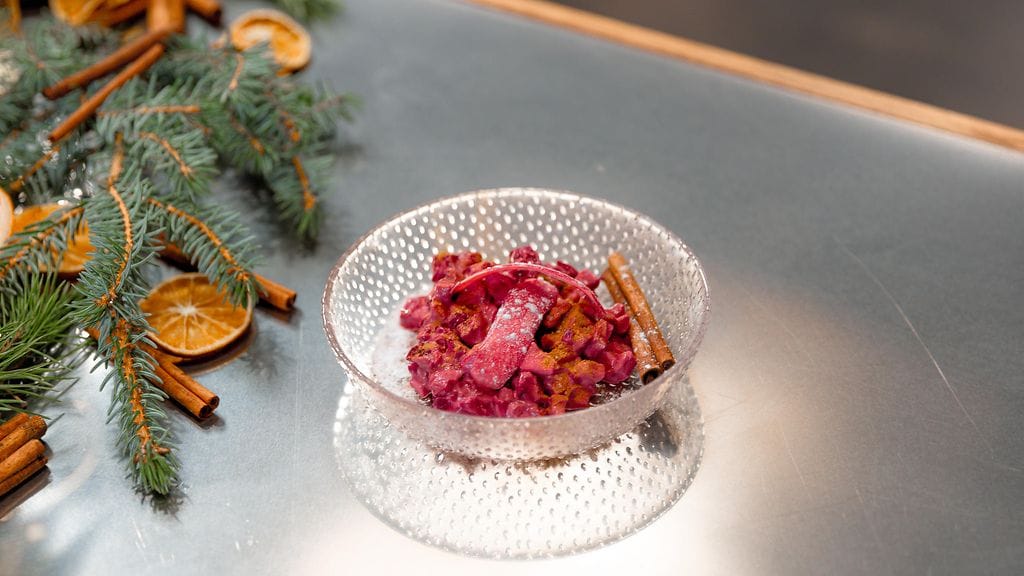 Leikkaa punajuuret, päärynä, omena ja porkkana pieniksi paloiksi (mitä pienempi sen parempi) ja heitä ne kulhoon