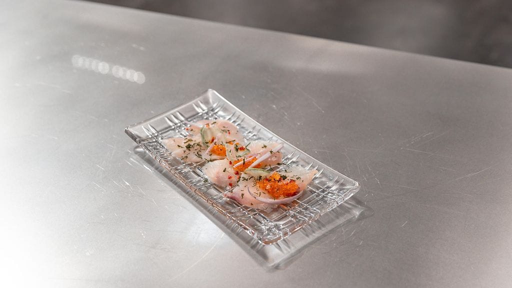 HIRAMASA: Leikkaa file siisteiksi pieniksi suunpalankokoisiksi paloiksi. Mausta palat suolalla. Lisää päälle sakea ja riisiviinietikkaa. Anna maustua n.30 min.
