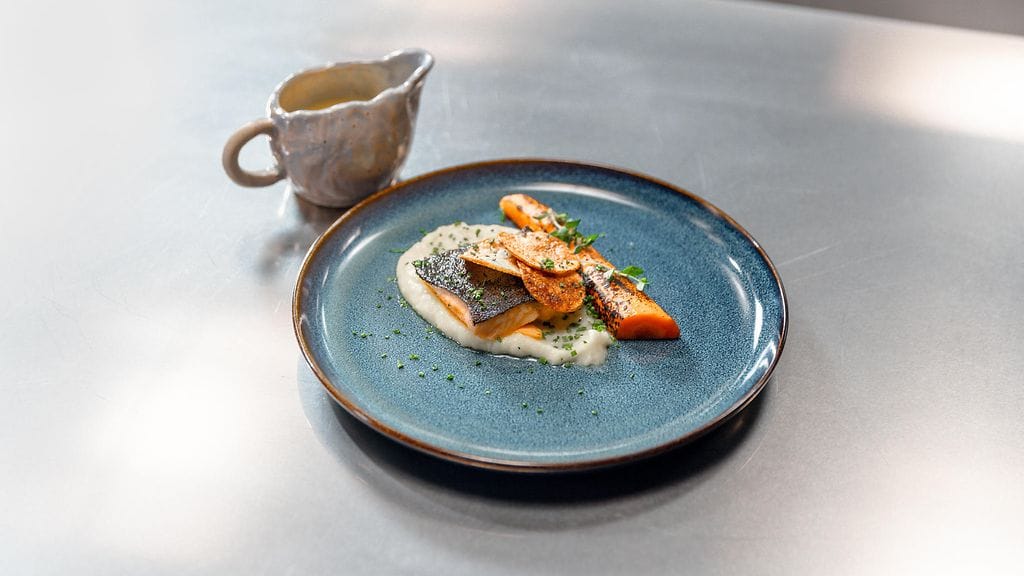 KALA: Laita pienelle uunipellille rypsiöljyä ja suolaa kauttaaltaan. Aseta kalafileet pellille niin, että nahkapuoli jää ylös. Tohota nahka kauttaaltaan rapeaksi. Paahda 180 asteisessa uunissa 2–5 minuuttia paksuudesta riippuen. Savusta ylijäänyt nahka savupistoolilla kulhossa ja lisää tuorekelmu kulhon päälle.