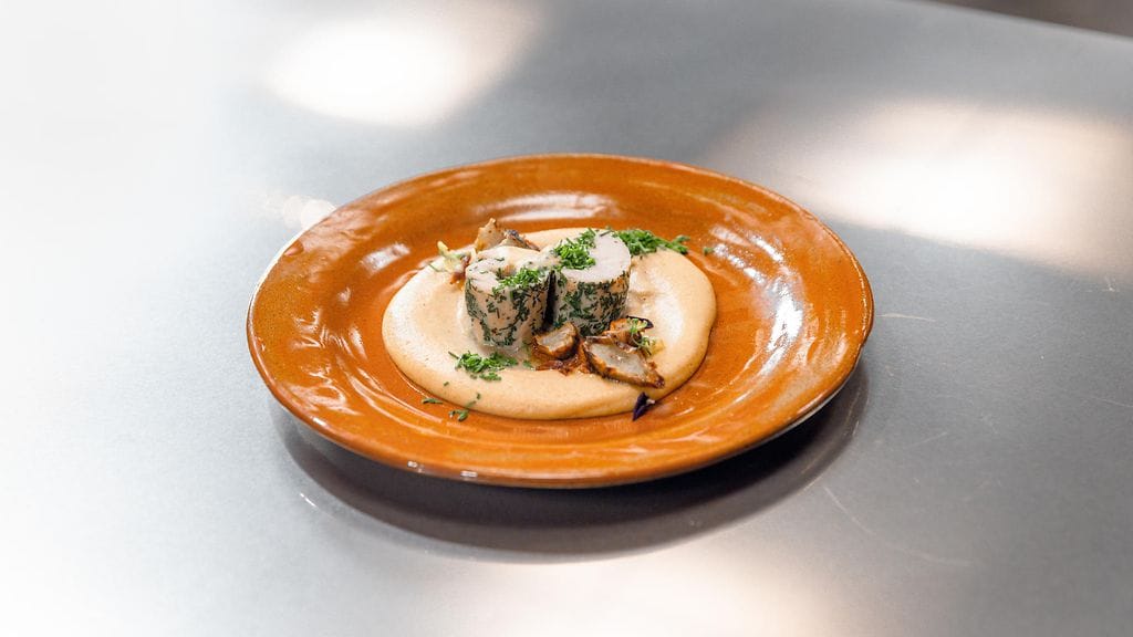 Renssaa kana ja ota rintafileestä nahka pois. Leikkaa valkosipuliruohosta hienoa chiffonadea. Pyöritä kananrintafilee pituussuunnassa tiukalle rullalle ja leivitä se valkosipuliruoholla ja suolalla, mutta jätä pieni osa vs-ruohoa koristeeksi. Kääri rulla tiukasti elmukelmuun ja tee elmukelmun päihin solmut (Voit tarvittaessa leikata pienet suikaleet kelmusta ja sitoa niillä kelmun päädyt). Laita vettä medium lämmölle kiehumaan ja laita ballotine sinne niin, että se juuri peittyy. Aseta lämpömittari kanaan ja odota, kunnes lämpötila nousee 75 asteeseen.