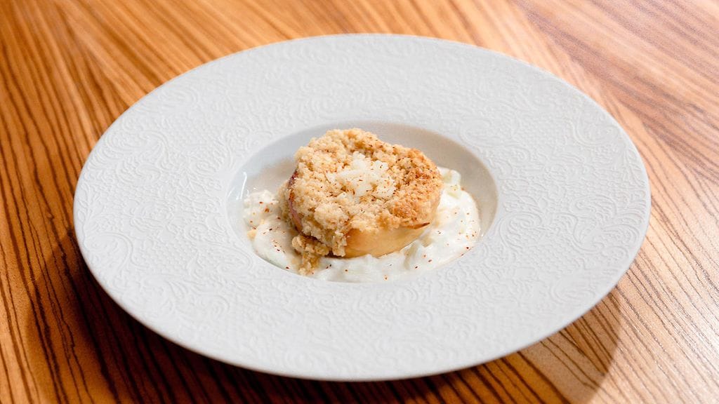 Laita uuni 175 asteeseen. Halkaise omena kahtia ja kuori lusikalla sisus ulos, niin että kuori ja reunasta hieman jää jäljelle. Laita kulhoon voi, kaurahiutaleet, jauhot ja sokeri. Nypi käsin niin että massa on murua. Valuta vaahterasiirappia päälle. Paista uunissa 25min. Jäähdytä paistamisen jälkeen.