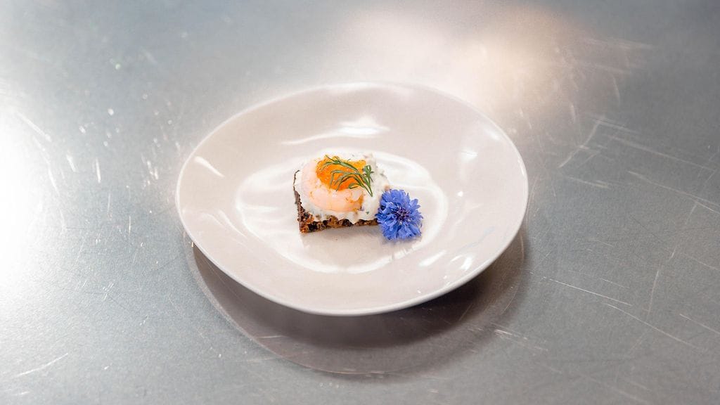 Pursota raputahnaa leipien päälle. Koristele kokonaisilla katkaravuilla, tillillä ja kirjolohenmädillä.