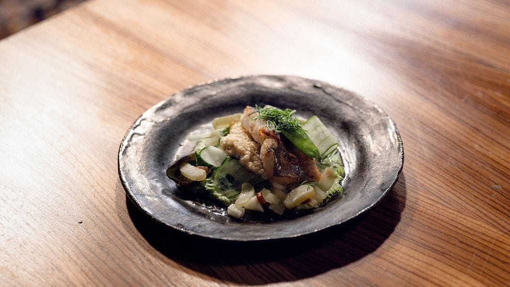 Suomuta ja fileoi kuha. Ota ruodot pois. Kuumenna öljy pannulla ja laita kuha ja osa fine brunoise raparpereista pannulle (kuha nahka alaspäin pannulle ja paista 50 asteiseksi). Käännä puolta pieneksi hetkeksi.