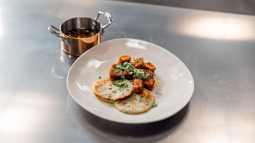 TOFU: Laita tofu prässiin, jotta saat nestettä puristettua pois tofusta. Sekoita sillä aikaa sipulijauhe, valkosipulijauhe, perunajauho ja suola. Kuumenna öljy 180 asteiseksi ja paista tofuja kuumassa öljyssä noin 3 min. Ota tofut ritilälle jäähtymään. Friteeraa tofut uudelleen juuri ennen tarjoilua noin 2 min, jotta ovat kunnolla rapeita.