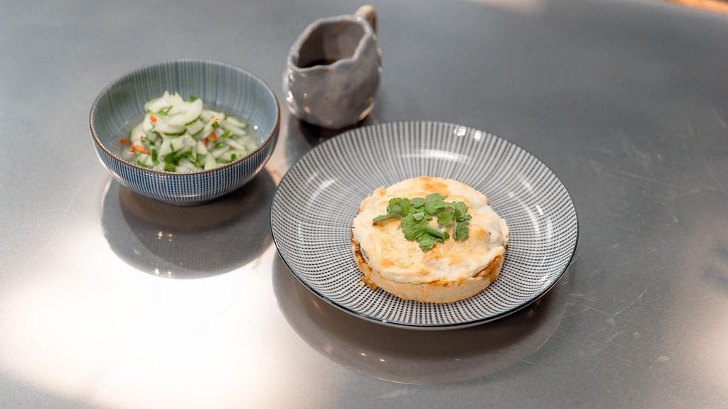 TAIKINA: Nypi 100 g voita jauhoihin ja lisää tarpeeksi kylmää vettä jotta saat taikinan muodostettua. Kauli, lisää loppu voi ohuina siivuina ja taita sekä kaulitse. Viilennä jääkaapissa välillä kelmuun käärittynä ja taita sekä kaulitse uudelleen. Anna levätä jääkaapissa.