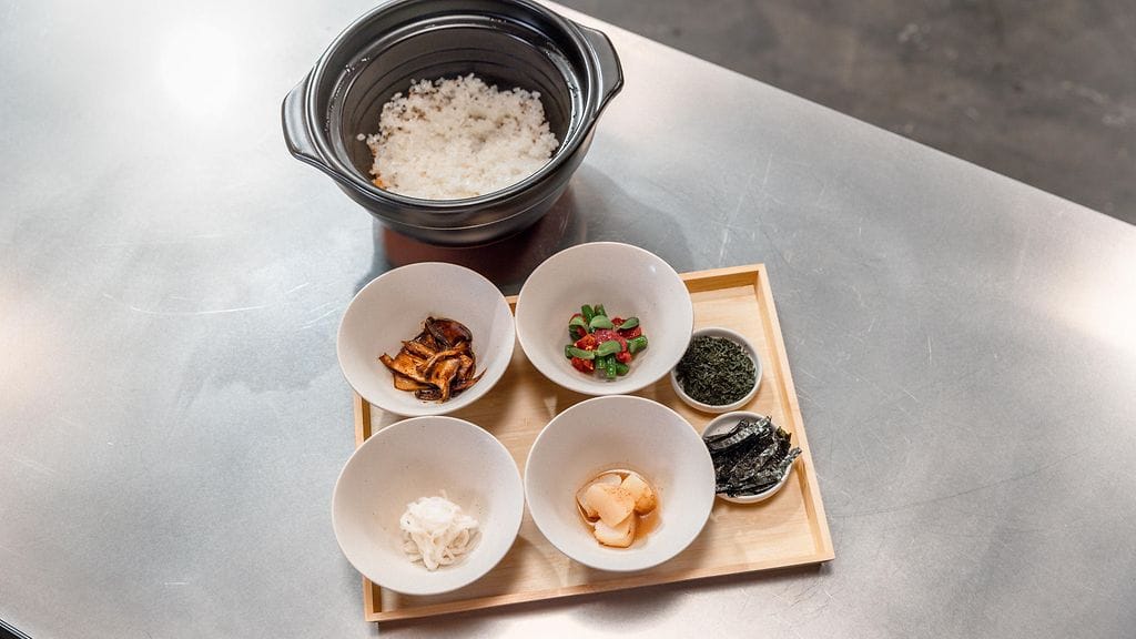 RIISI DONABESSA: Huuhtele riisi kolme kertaa ja valuta hyvin. Lisää riisiin 1 ruokalusikka sieniöljyä, kojiliemi, kombu sekä vesi ja anna riisin levätä puoli tuntia Donabessa. Kiehauta vesi, ja keitä noin kymmenen minuuttia pienemmällä lämmöllä. Ota kattila sivuun, peitä pyyhkeellä ja anna levätä vielä 5–10 minuuttia. Kostealla puulastalla sekoita riisi varovasti ja lisää joukkoon riisiviinetikka sekä loput sieniöljyt. Tarjoile lämpimänä lisukkeiden kera.