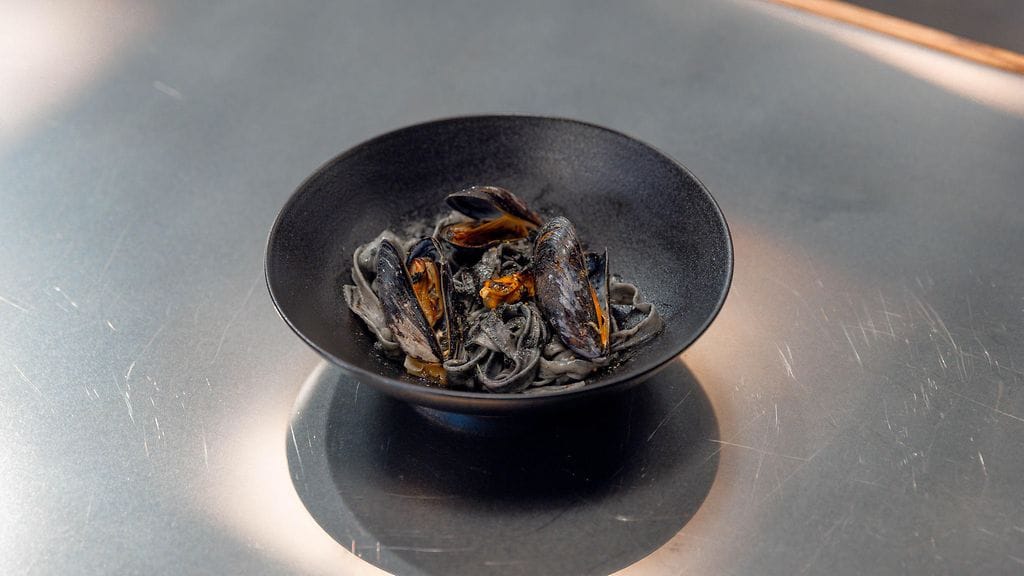MARMORIPASTA: Sekoita jauhot ja munat keskenään. Vaivaa taikinaa 10 minuuttia käsin tai yleiskoneessa. Lisää vaivauksen lopulla elintarvikeväri, jotta pastaan tulee tummia raitoja. Kääri taikina kelmuun ja anna vetäytyä noin 20 minuuttia. Vetäytymisen jälkeen kaulitse pastakoneen läpi ja tee valitsemallasi terällä pastaa. Keitä runsassuolaisessa vedessä muutama minuutti, kunnes kypsää, mutta napakkaa.