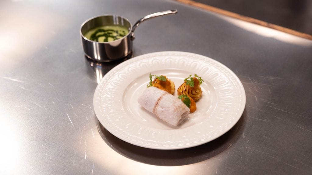 KALA: Fileoi kala fileiksi, poista fileistä nahka ja kaikki ruodot. Laita fileille suolaa ja sitruunamehua, kierrä rullalle pyrstöstä alkaen. Kierrä filerullat tiukkaan kelmuun ja keitä rullat sirkulaattorissa 50 asteessa.