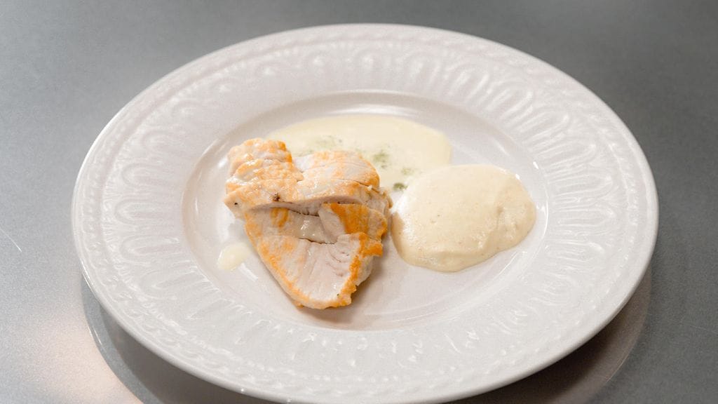 Laita vesi kiehumaan. Pilko kanasta ylijääneet luut ja nahka, sekä puolikas sipuli. Laita sipuli ja luut kiehuvaan veteen. Lisää veteen myös timjamia, suolaa ja pippuria oman maun mukaan. Keitä lientä kasaan kovalla lämmöllä. Kun seos on kiehunut noin 30 min, kaada siivilän läpi lientä toiseen kattilaan noin 1,5 dl. Jatka liemen kasaan keittämistä, kunnes jäljellä on noin 0,5 dl. Lisää kermaa pikkuhiljaa ja maistele kunnes kermainen kastike on taittanut kasaan keitetyn liemen pehmeäksi. Mausta vielä lopuksi suolalla.Kaada sauvasekoittimenkulhoon noin 0,5 dl rypsiöljyä. Lisää noin 10 timjamin oksaa. Aja seos tasaiseksi sauvasekoittimella. Lisää valkoviinietikkaa yksi ruokalusikallinen kerrallaan ja sekoita. Maista seosta ja lisää etikkaa tarvittaessa. Etikan tarkoitus on saada öljystä hieman hapokas. Lisää suolaa oman maun mukaan.