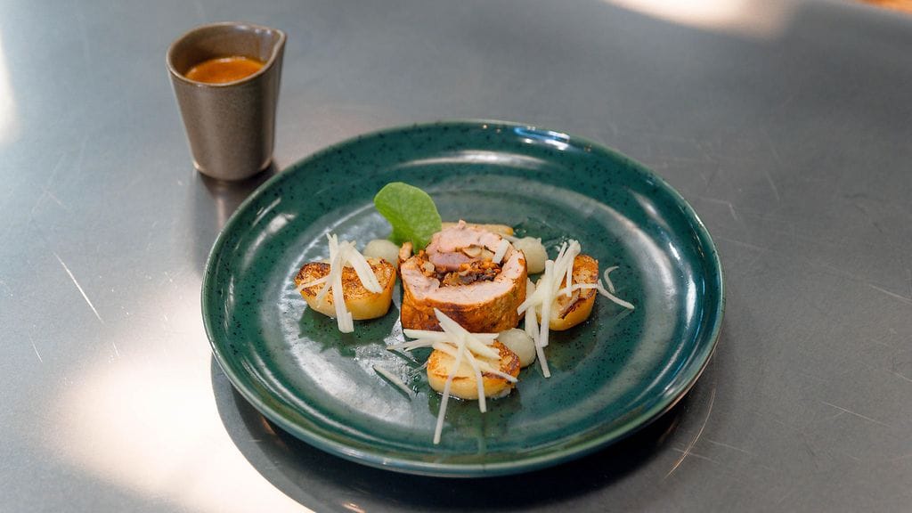 Possurulla: Paista paloitelluista sienistä neste pois kuivalla pannulla ja lisää voita. Lisää kuutioidut sipulit ja omenat. Paista pehmeäksi. Leikkaa possu ohueksi levyksi ja nuiji. Suolaa ja pippuroi. Levitä täyte possulle ja kääri rullalle. Sido rulla. Paista pannulla pinnat ja laita pannu uuniin 225 astetta noin 25 minuuttia.
