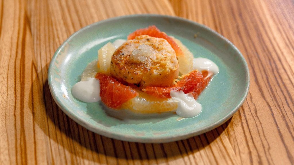 Leikkaa verigreippi ja appelsiini siistiksi siivuiksi. Siirrä kulhoon ja laita mukaan ripaus sokeria.