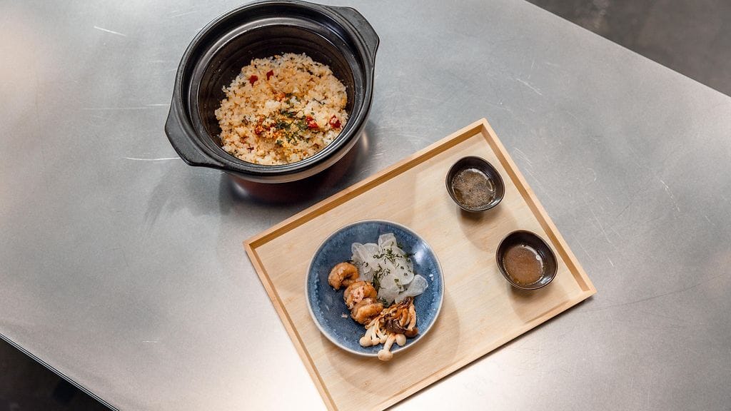 Kaada riisi keittimeen ja lisää vesi. Anna riisin seistä keittimessä 30 min. Tämän jälkeen käynnistä riisinkeitin, keitä riisiä 10 min, älä avaa kantta välillä. Kun riisi on kiehunut, ota astia pois levyltä ja laita pöydälle lepäämään muutamaksi minuutiksi. Sekoita hellästi ja anna levätä vielä 5 min. Lisää loput ainekset joukkoon.