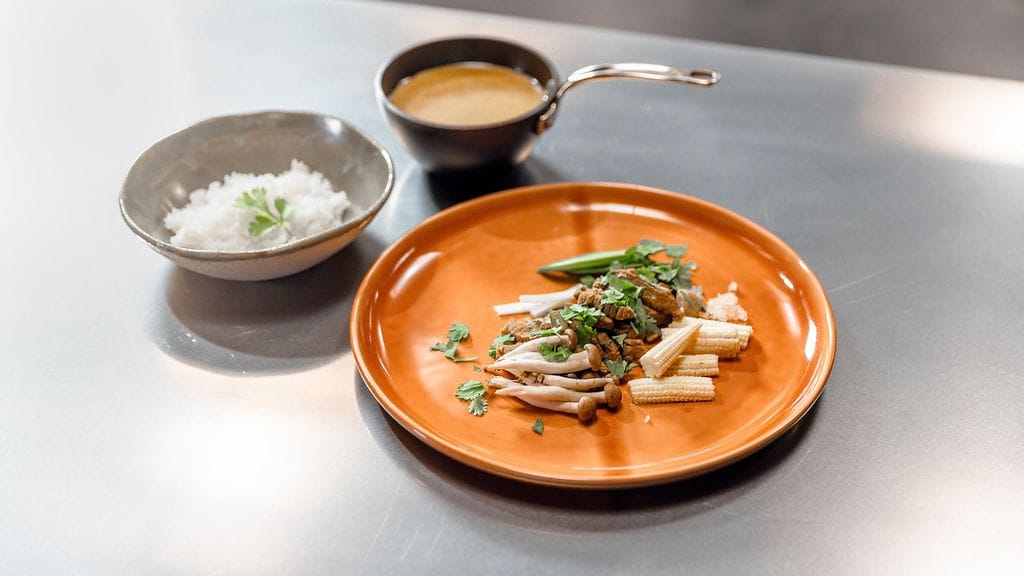 Paahda jauhot kuivassa kattilassa ruskeiksi, mutta älä polta. Lisää jauhoihin 60 g voita ja anna paahtua hetken sekoitellen. Lisää kanalientä vähän kerrallaan koko ajan sekoittaen.