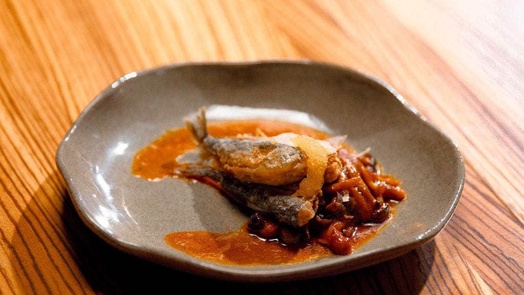 Tarjoilu. Laita lautaselle sienet ja muikut ja kaada päälle ruskistettu voi ja Yuzukastiketta ja viimeistele annos mädillä, bonitohiutaleilla ja ripauksella togarashia.