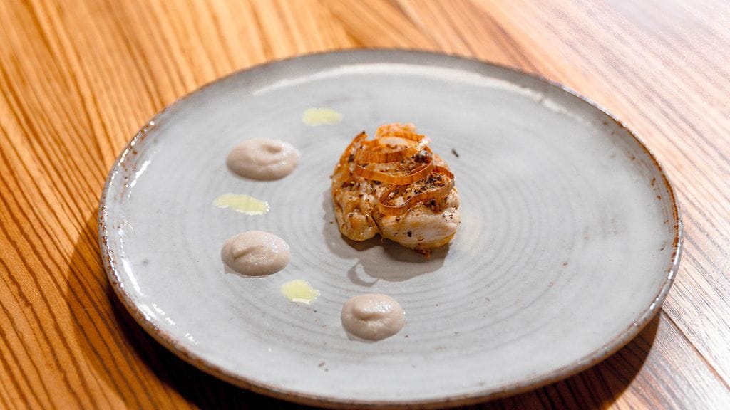 Kuori ja hienonna salottisipulit ja 1 valkosipulin kynsi. Kuullota sipuleita pannulla n. 10min kunnes ne pehmenevät. Lisää kuohukerma ja sokeri. Anna hautua kunnes kerma on imeytynyt sipuleihin. Mausta suolalla ja pippurilla. Laita sipulit blenderiin ja laita täydelle teholle n. 1 minuutiksi. Laita pyree pursotinpussiin ja purista lautaselle.