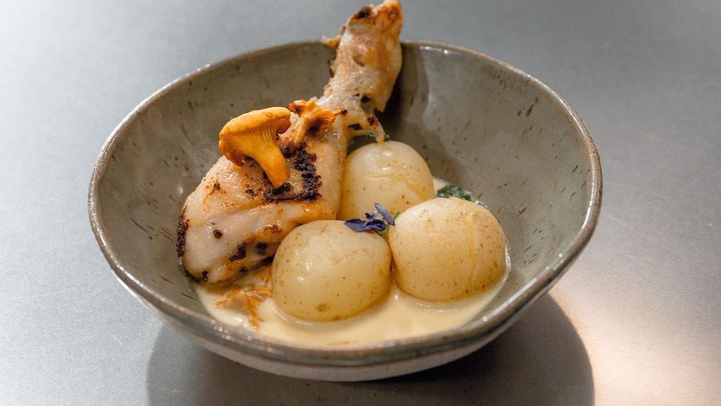 Koristele annos tillillä, kokonaisilla pienillä kanttarelleilla sekä syötävillä orvokeilla.