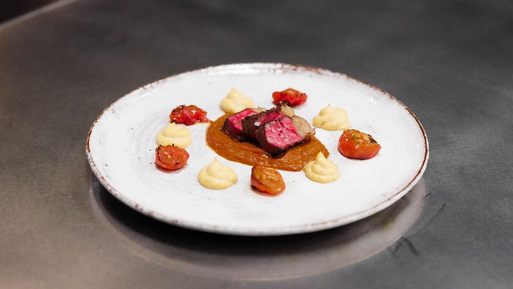 Pilko keltaiset tomaatit pienemmiksi paloiksi ja laita kuivalle pannulle. Paista tomaateista ylimääräinen neste pois. Siirrä tomaatit paistinpannun reunoille ja lisää keskelle reilu ruokalusikallinen voita. Anna voin sulaa ja kuumentua kunnolla. Kaada pannulle pari ruokalusikallista calvadosta ja sytytä rasva-calvados seos palamaan esimerkiksi toholla. Soseuta tomaatit tehosekoittimessa. Jäähdytä seos. Kaada seos kattilaan ja lisää joukkoon neljä keltuaista. Kuumenna seosta miedolla lämmöllä niin kauan, että seos sakenee. Lisää joukkoon 25g voita, sekoita voi seokseen sauvasekoittimella. Kaada seos pursotinpussiin ja laita jääkaappiin jäähtymään.