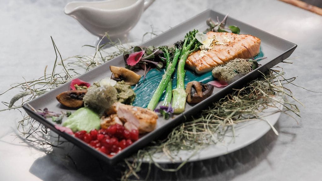 3. Leikkaa lohipalat nahattomiksi annospaloiksi. Paista kuumalla pannulla, mausta suolalla, pippurilla ja sitruunamehulla. Lisää päälle lehtikultaa.