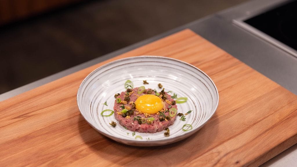 Tee liha massasta muotilla pyöreä ja tee kuoppa keskelle johon laitat keltuaisen. koristele sinapin siemenillä, kevätsipulilla, fritatuilla kapriksilla ja timjamilla.