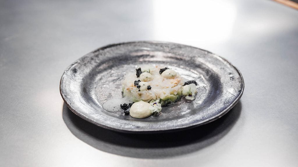 Kokoa annos asettamalla tartar-muotti lautaselle. Lusikoi alle kuutiosalaatti ja päälle suolalla maustettu ravunliha. Pursota päälle rapukreemi ja lusikoi vaahto. Koristele annos mädillä ja kukilla.