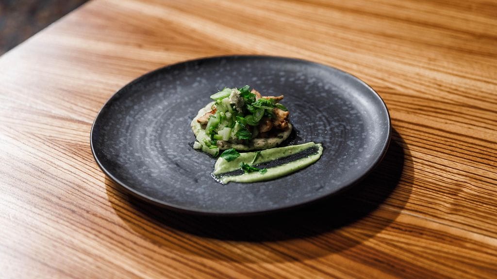 2. Kuori wasabi ja raasta hienoksi. Sekoita wasabi ja hienoksi silputut wasabin lehdet majoneesiin. Soseuta sauvasekoittimella tasaiseksi. Mausta suolalla ja etikalla.