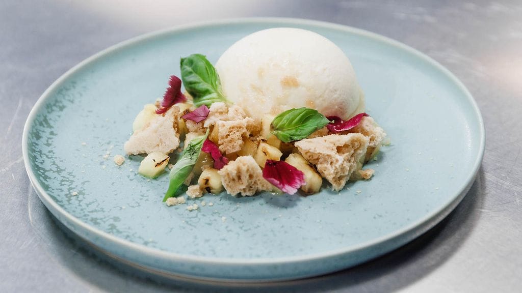 Kiehauta maito ja lisää liotettu liivate. Kaada kuumana valkosuklaan päälle, sekoita hyvin kunnes suklaa on sulanut ja massa emulgoitunut. Vaahdota kerma ja nostele huoneenlämpöisen valkosuklaamassan sekaan. Kaada hieman jähmettynyttä massaa isompaan muottiin ja lisää jäätynyt mangopallo. Peitä valkosuklaamassalla. Jäädytä ja ota pois muoteista ennen maistelua.