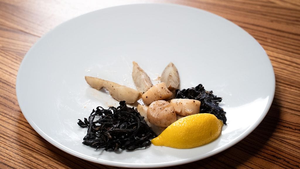 Valmista kampasimpukat. Paista kampasimpukat nopeasti pannulla voissa ja öljyssä. Mausta suolalla ja sitruunanmehulla.