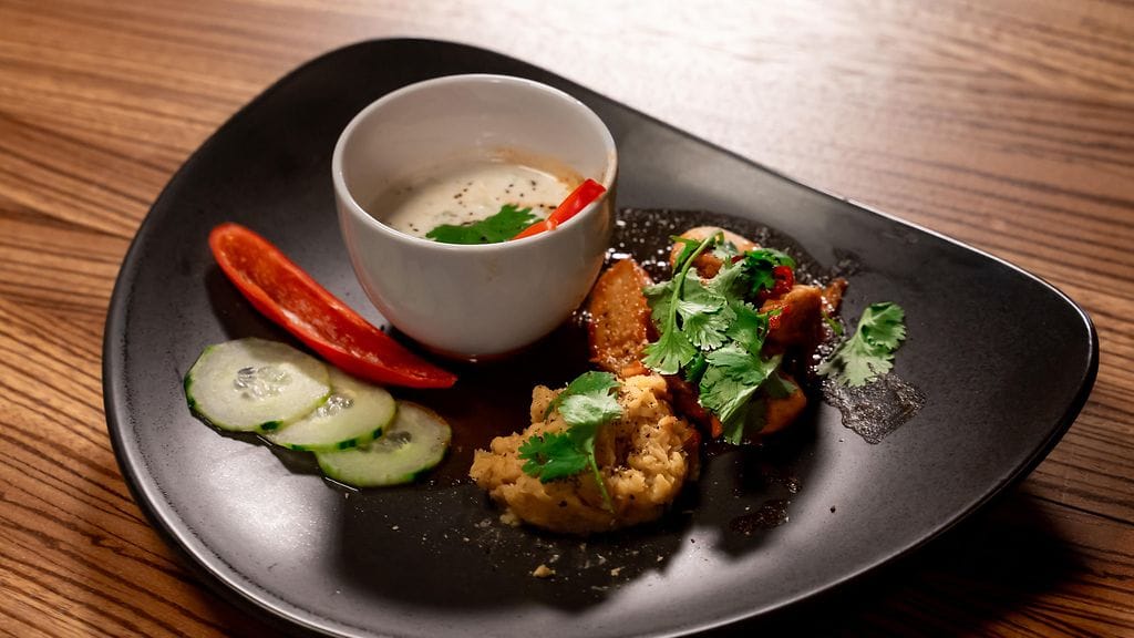 Valmista kana. Laita kaikki raaka-aineet vakuumipussiin. Kypsennä 68 asteisessa sirkulaattorissa noin 20 minuuttia.
