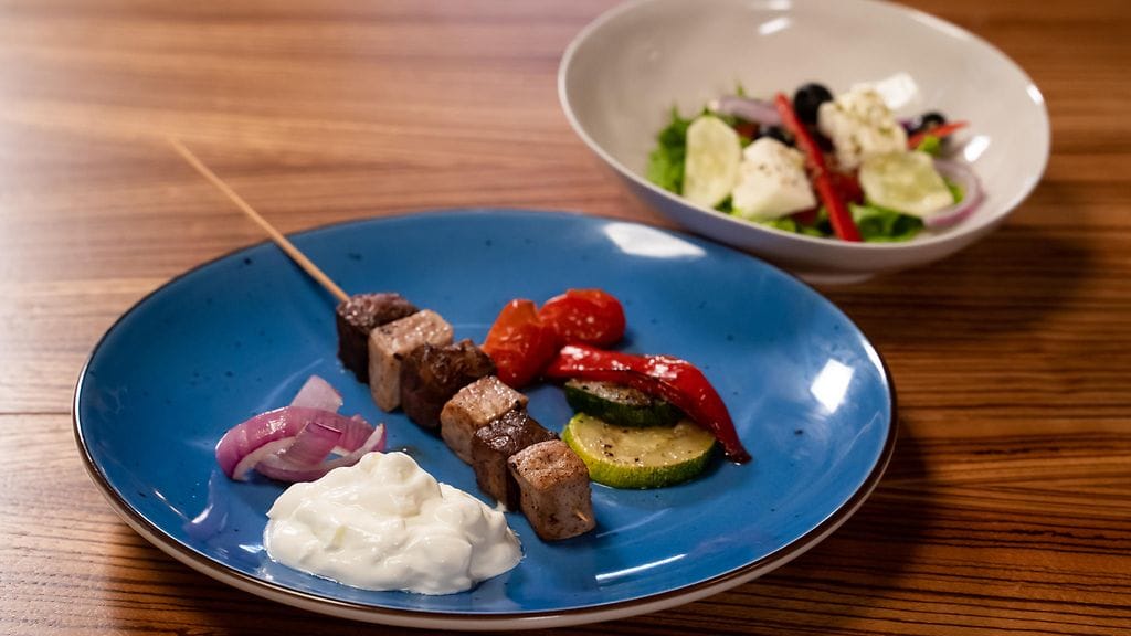 Valmista tzatziki. Hienonna kurkku ja valkosipulinkynsi. Sekoita raaka-aineet keskenään ja mausta suolalla.