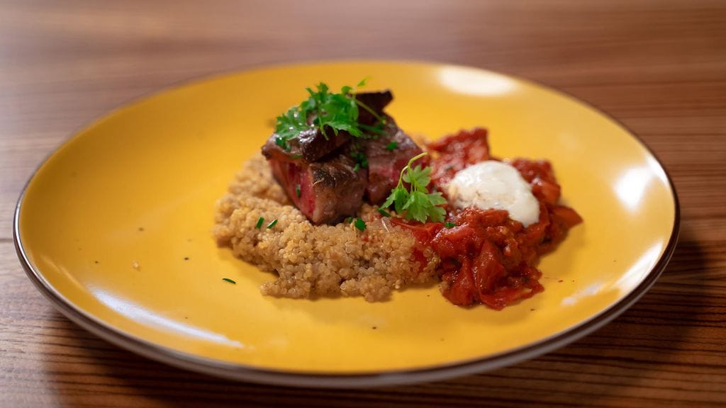Valmista pihvit. Leikkaa ulkofileestä kaksi pihviä. Paista pinnat kiinni voissa pannulla. Mausta pippurilla ja suolalla. Kypsennä 150 asteisessa uunissa kunnes sisälämpömittari on 54 astetta. Anna vetäytyä folion alla.
