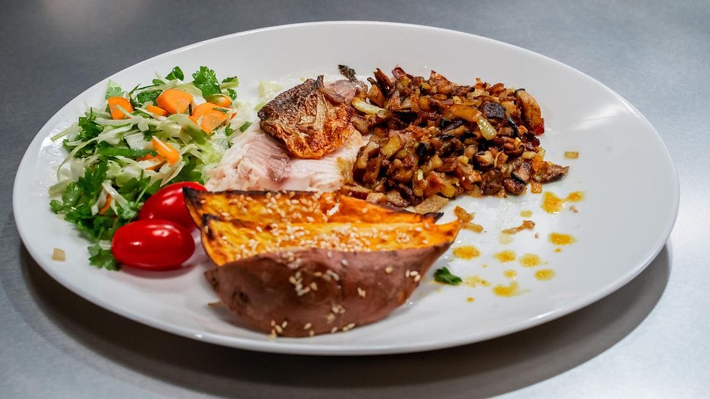Valmista bataattilohkot. Pilko bataatti lohkoiksi ja pyörittele lohkot öljyssä. Mausta seesaminsiemenillä, pippurilla ja suolalla. Paahda 200 asteisessa uunissa noin 20 minuuttia tai kunnes bataattilohkot ovat rapeita.