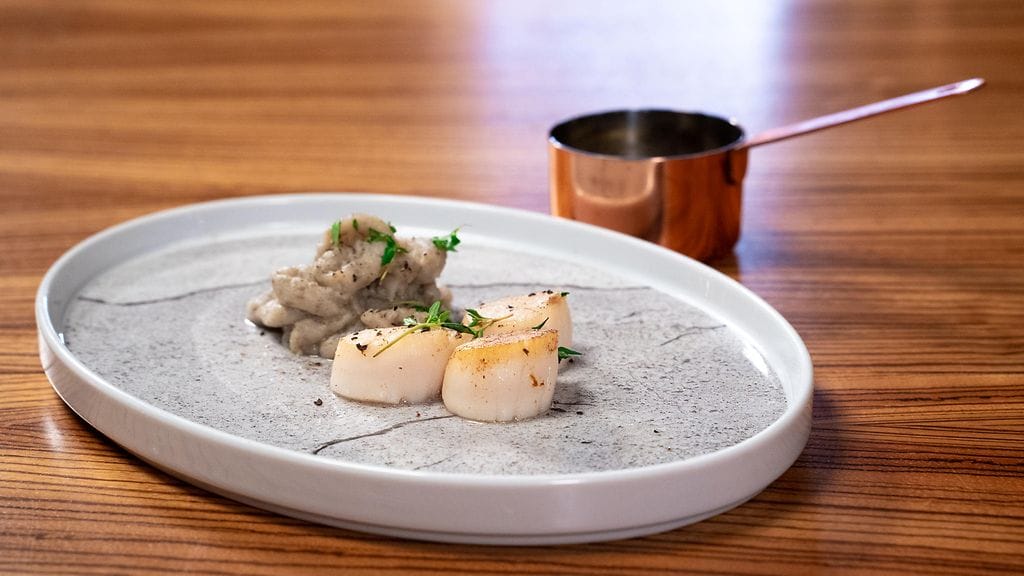 Valmista kampasimpukat. Paista kampasimpukat nopeasti voissa pannulla. Mausta suolalla ja pippurilla.