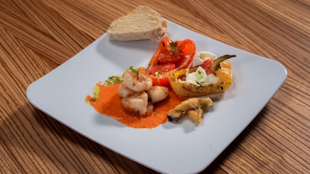 Valmista paprikapyre. Pilko paprikat ja tomaatit isoiksi paloiksi. Kuullota pehmeiksi öljyssä ja laita blenderiin. Aja pyreeksi ja mausta suolalla.