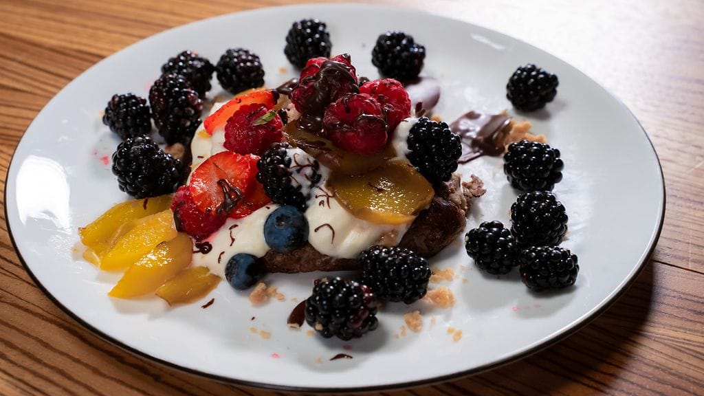 Paista banaanilettu ruskeaksi. Aseta lettu lautaselle, lisää kermavaahto, persikkakastike, marjat sekä Omar-rouhe.