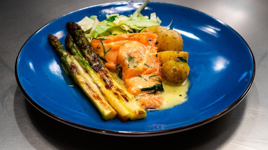 Valmista lohi. Laita lohifileestä leikatut annospalat vakuumipussiin yrttien ja suolan kanssa. Sulje vakuumipussi ja laita 47 asteiseen sirkulaattoriin noin 45 minuutiksi.