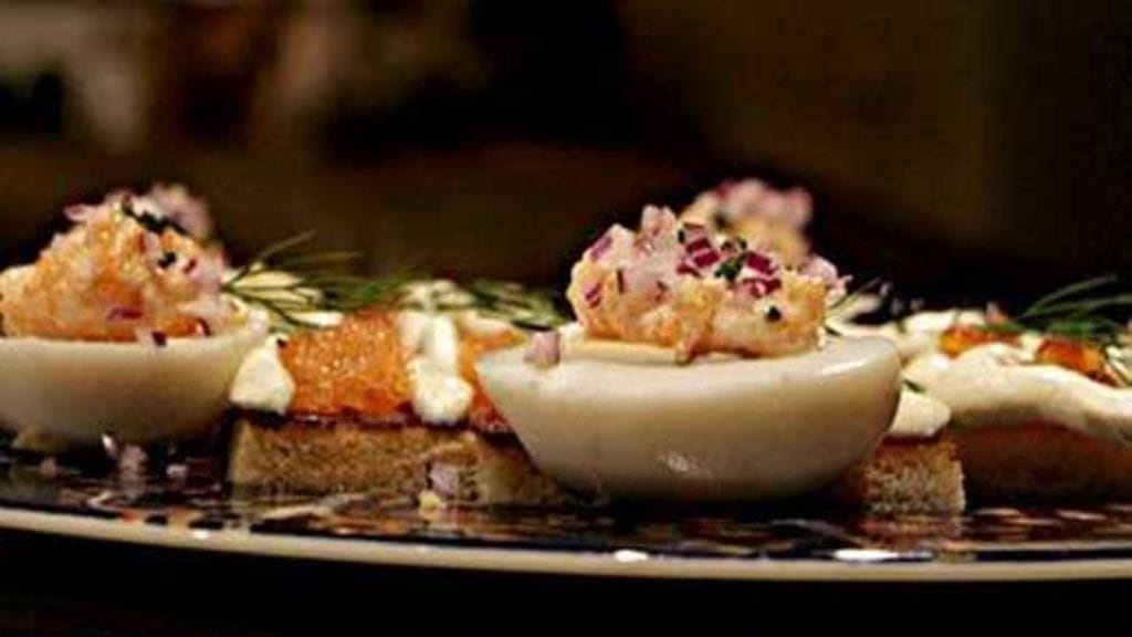 Keitä kananmunat kypsiksi ja jäähdytä ne. Kuori ja halkaise pitkittäin. Poista keltuainen kulhoon ja lisää mukaan majoneesi. Riko rakenne haarukalla ja lisää mukaan hienonnettua ruohosipulia ja mäti. Sekoita varovaisesti keskenään. Mausta kevyesti suolalla ja mustapippurilla. Lusikoi täyte takaisin kananmunaan. Kuori ja hienonna punasipuli erittäin hienoksi. Ripottele munien päälle juuri ennen tarjoilua.