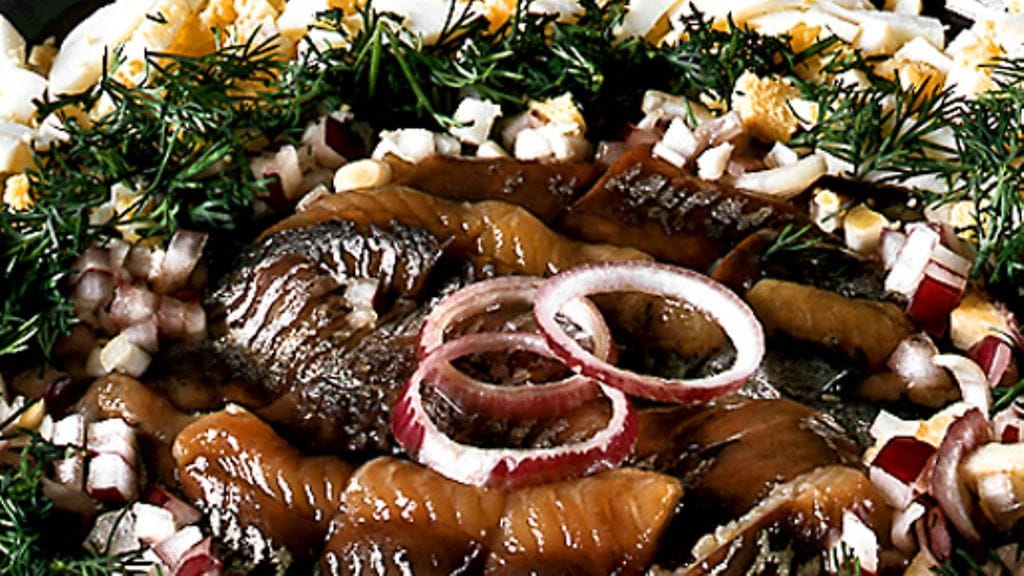 1. Asettele sillit vadille. Hienonna munat, sipulit ja tilli ja asettele ne kalan ympärille.