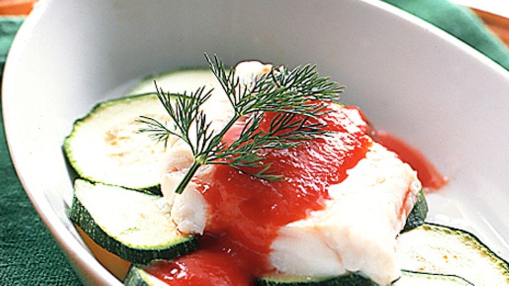 1. Viipaloi kesäkurpitsat ja asettele viipaleet limittäin vuokaan tai suoraan lautaselle. Nosta kala kesäkurpitsaviipaleiden päälle ja peitä paseeratulla tomaatilla. Mausta suolalla ja pippurilla.