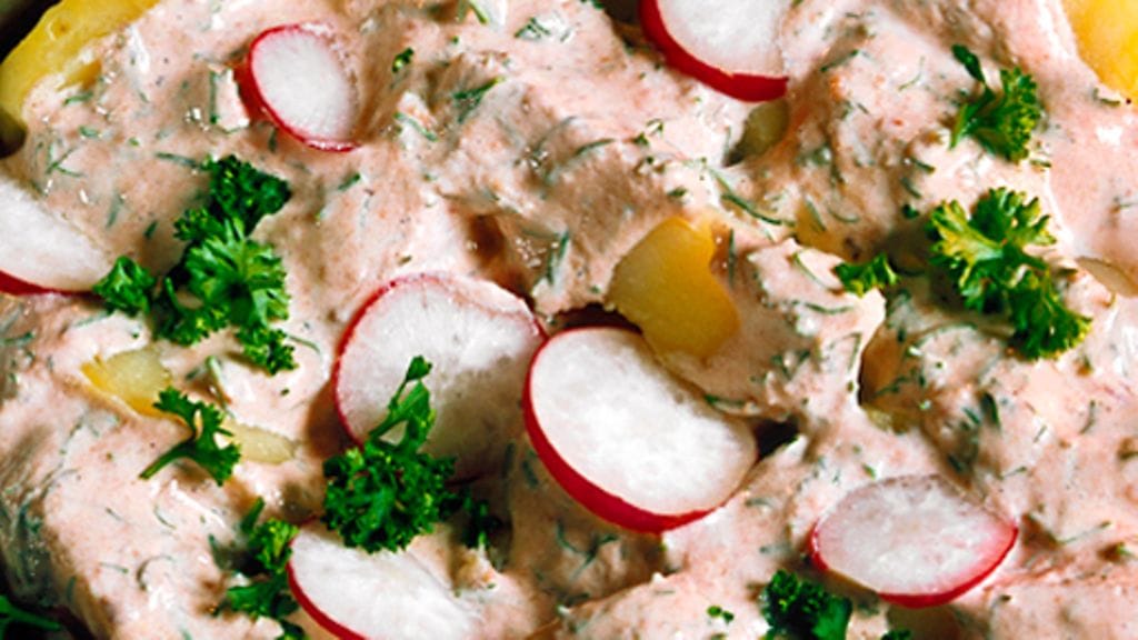 Perunasalaatti kermaviilikastikkeella sopii hienosti savustetulle, kylmälle lihalle ohuina viipaleina.
