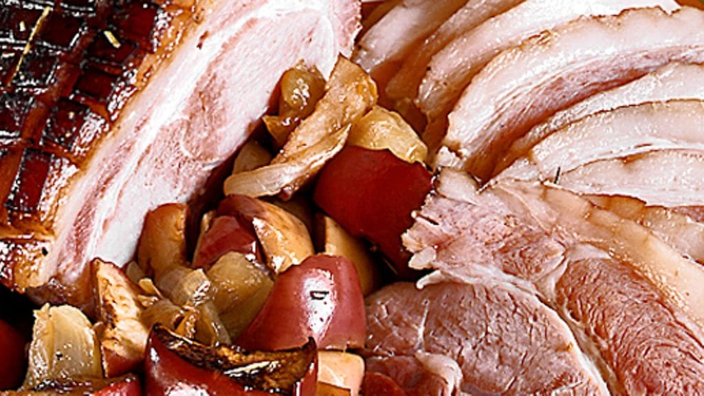 3. Paista uunin alatasolla n. 1 tunti. Avaa folio ja lisää omenat kinkun ympärille ja penslaa liha lopulla penslausöljyllä.