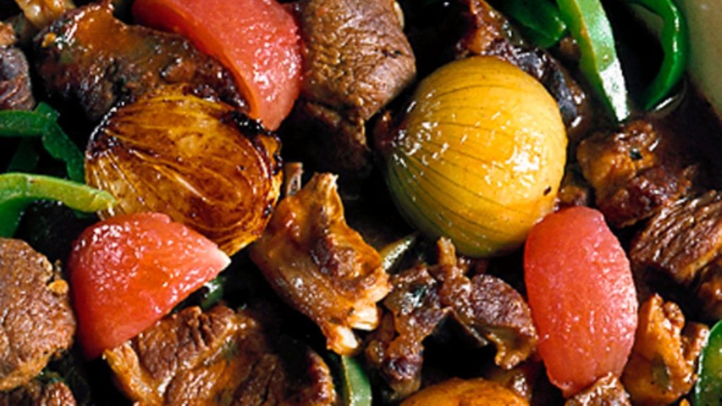 1. Mausta ja ruskista voissa lihapalat pannulla, siirrä pataan. Ruskista sen jälkeen sipulit ja nosta pataan.