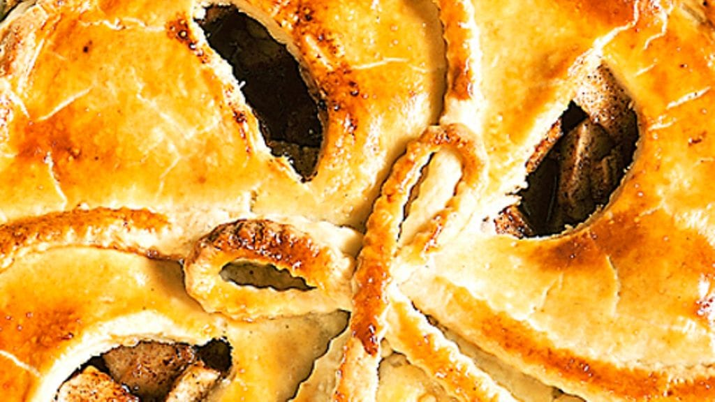 3. Kauli lopusta taikinasta kansi ja nosta se vuokaan omenien päälle. Penslaa munalla ja paista noin 35 minuuttia. Tarjoile piiras jäähtyneenä.
