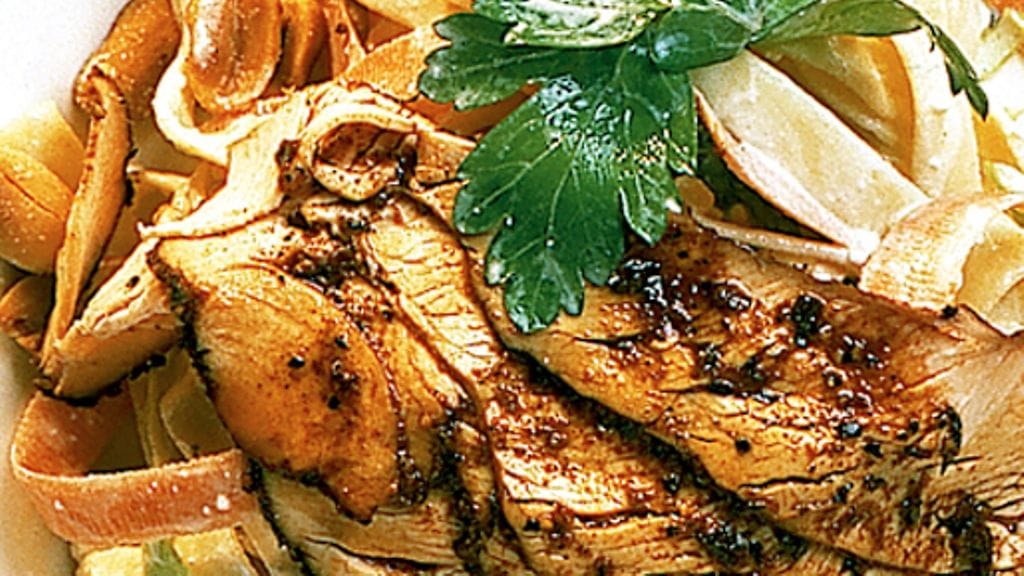 2. Tee öljystä, karkeasta suolasta ja puristetuista valkosipulinkynsistä marinadi ja pane kalkkunanrinta ja marinadi paistopussiin. Anna marinoitua jääkaapissa kuuden tunnin ajan. Kääntele silloin tällöin. Ota kalkkunanrinta marinadista ja pyörittele sitä paahdetuissa mausteissa. Pane se sitten takaisin paistopussiin marinoitumaan vielä 12 tunniksi.
