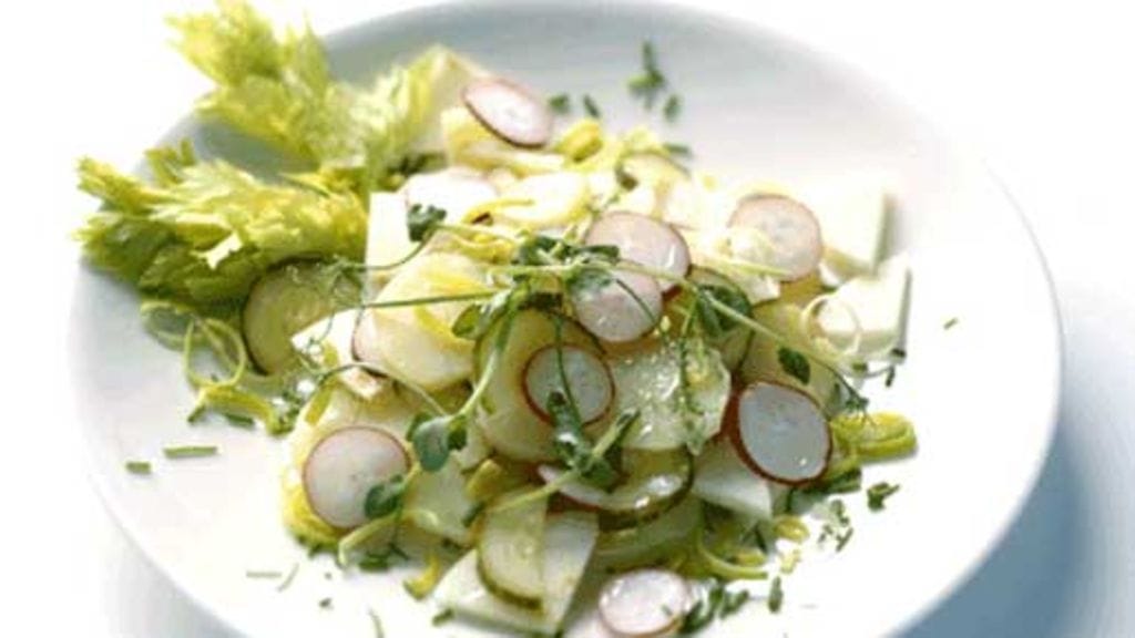 Viipaloi perunat, omena, retiisit ja maustekurkku. Hienonna purjo ja ruohosipuli. Lado ainekset kerroksittain kulhoon.