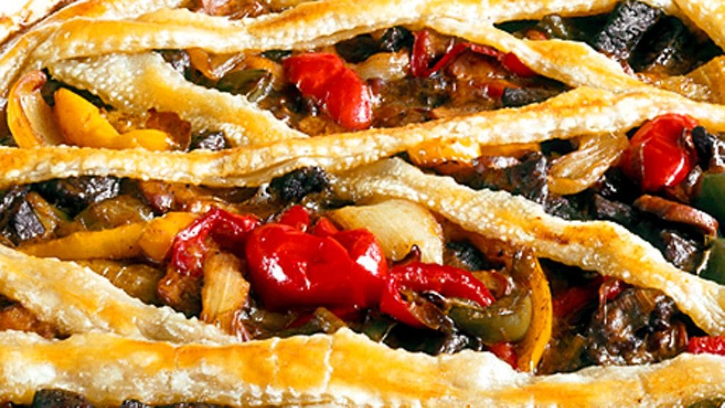 3. Paista sipulia ja purjoa ilman että ne saavat väriä, lisää paprika muutamaksi minuutiksi, kaada kaikki pataan. Paista sieniä kunnes kaikki neste on haihtunut ja lisää pataan. Puuteroi päälle jauhoja, sekoita. Lisää tomaattipyree, kerma ja liemi. Anna kiehua hiljalleen kunnes liha tuntuu murealta, n. 20 minuuttia.