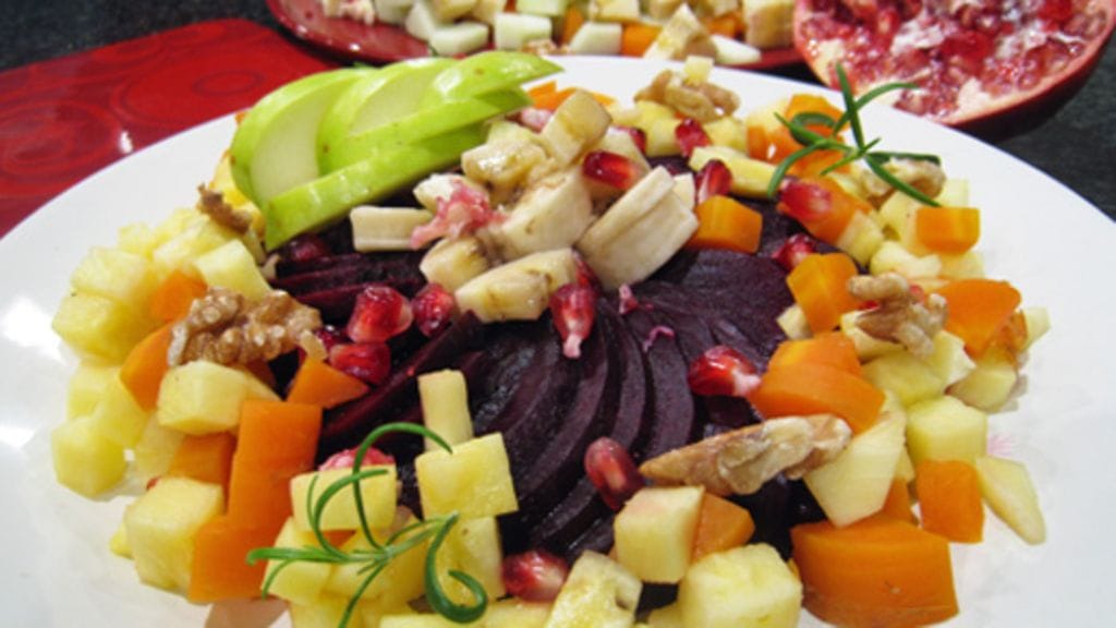 Kuori ja pilko kaikki hedelmät, punajuuret ja porkkana. Sekoita kaikki ainekset keskenään tai asettele ne vadille erikseen. Sekoita sitruunanmehu, rypsiöljy, sokeri ja suola keskenään.