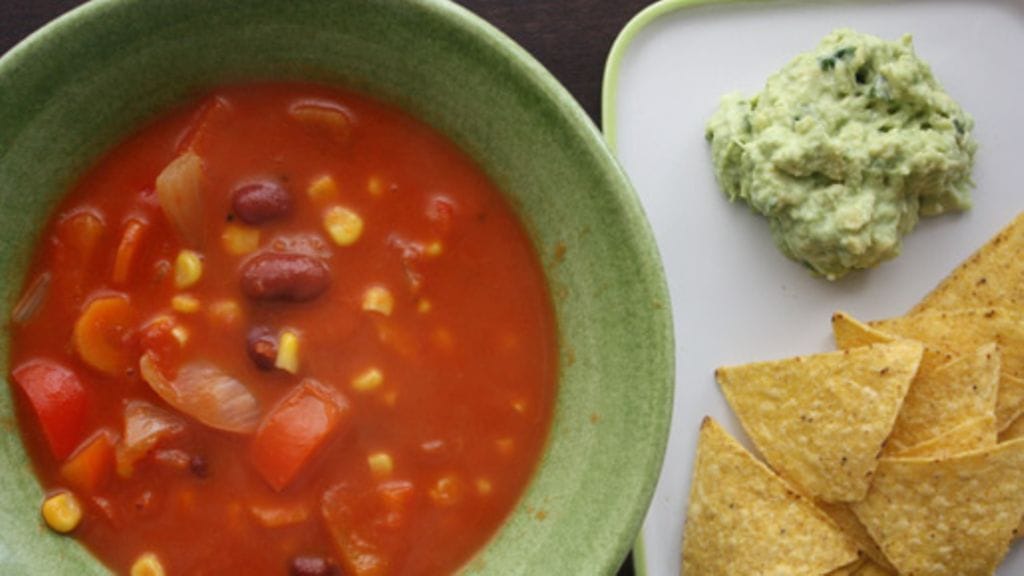2. Lisää tomaattimurska, pavut ilman nestettä ja reilu puoli litraa kasvislientä. Lisää mustapippuri, suolalla ja chilirouheella.