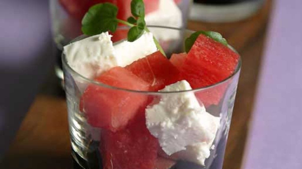 Leikkaa vesimeloni kolmioiksi ja poista kuori. Leikkaa fetajuusto viipaleiksi.