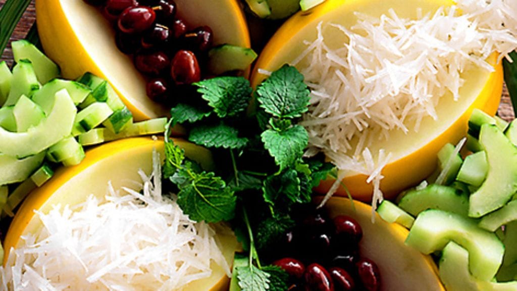 1. Halkaise meloni ja poista siemenet, lohko meloni. Kuori kurkku, poista siemenet ja paloittele puolikuiksi. Raasta retikka karkeasti.